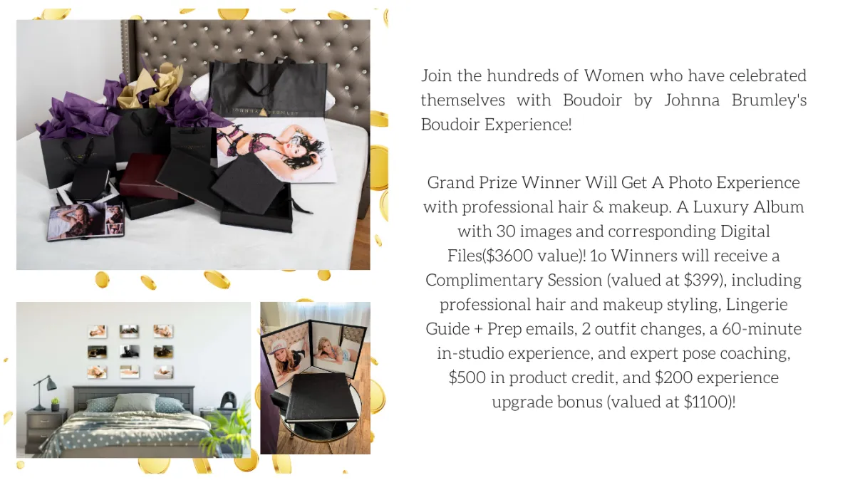 Grand Prize Winner Will Get A Photo Experience with professional hair & makeup. A Luxury Album with 30 images and corresponding Digital Files($3600 value)! 10 Winners will receive a Complimentary Session (valued at $399), including professional hair and makeup styling, Lingerie Guide + Prep emails, 2 outfit changes, a 60-minute in-studio experience, and expert pose coaching, $500 in product credit, and $200 experience upgrade bonus (valued at $1100)!